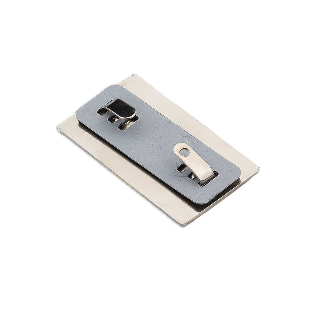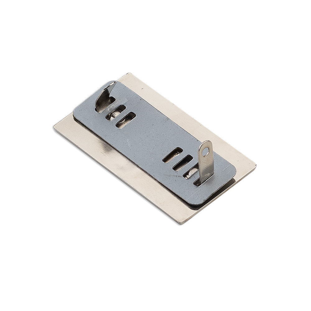 Placa em inox medindo 5x3cm, exclusiva para fixação em mochilas e malas, ideal para gravação a laser. Possui travas para fixação.