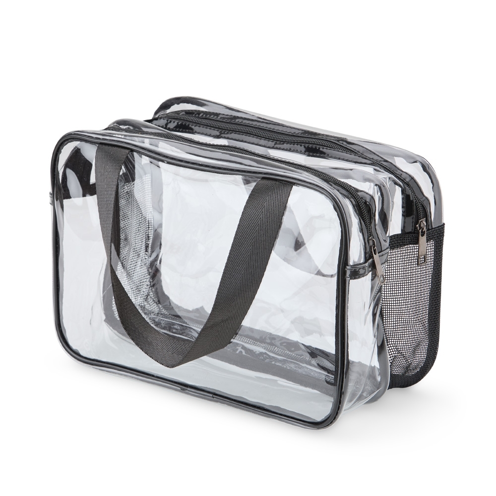 Nécessaire em PVC e nylon dividido em dois compartimentos: um fechado em plástico impermeável para proteger o conteúdo e outro com fundo e laterais em tela, ideal para armazenar itens molhados e separá-los dos secos. Conta ainda com um par de alças laterais em nylon para transporte.
