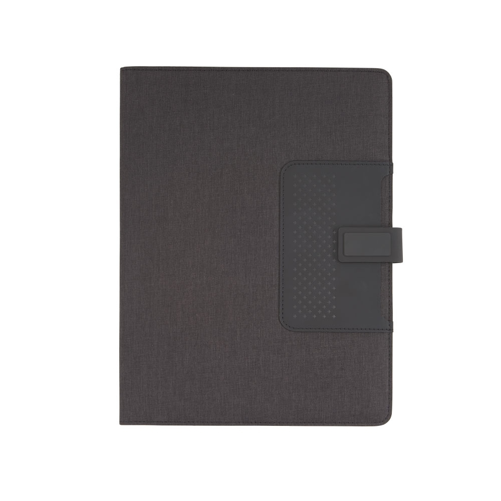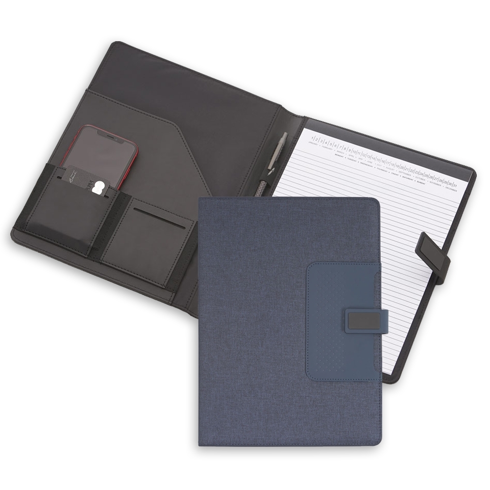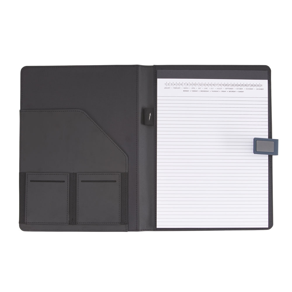 Pasta convenção com bloco para anotações. Pasta confeccionada em material sintético, possui fecho imantado com plaquinha emborrachada, “bolso” interno para arquivar documentos, suporte para cartões, celulares e caneta, além de um bloco com folhas brancas pautadas de aproximadamente 22 folhas.