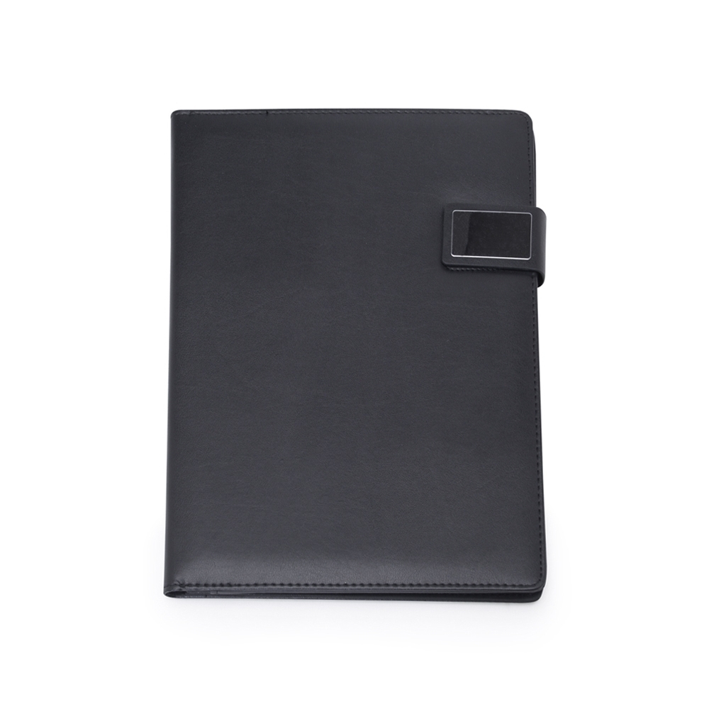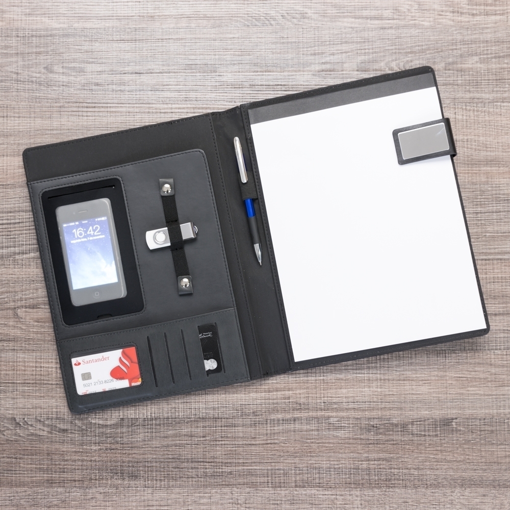 Pasta convenção de couro sintético com trava de imã lateral, possui uma placa de metal na trava ideal para personalização. Possui “bolso” para arquivar documentos, porta celular com visor fosco, porta cartões com divisórias e visor além de um bolso atrás, suporte elástico para caneta(não acompanha) e bloco A4 com aproximadamente 20 folhas brancas pautadas de verso liso.