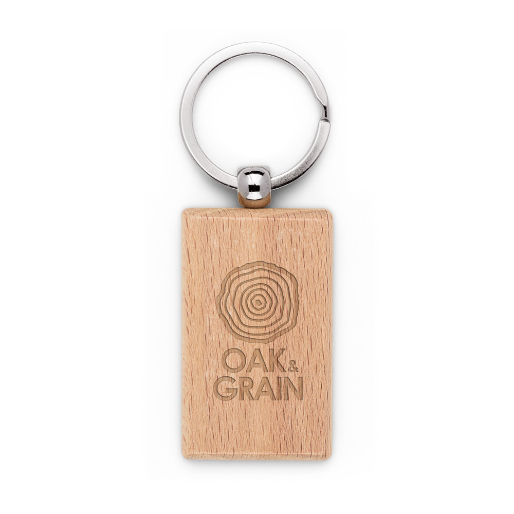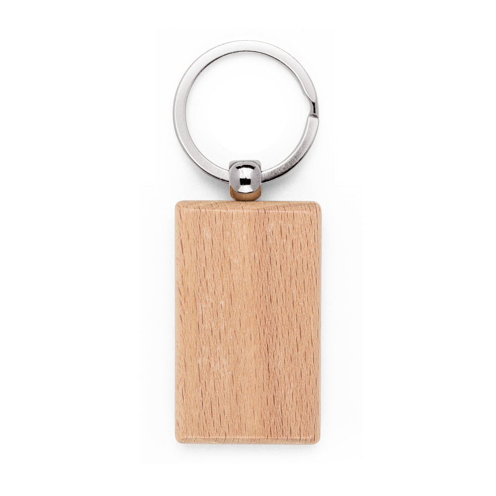 Chaveiro em formato retangular em madeira de faia, resistente e elegante, com argola de ferro. A cor e o resultado da impressão nos materiais naturais pode variar entre produtos