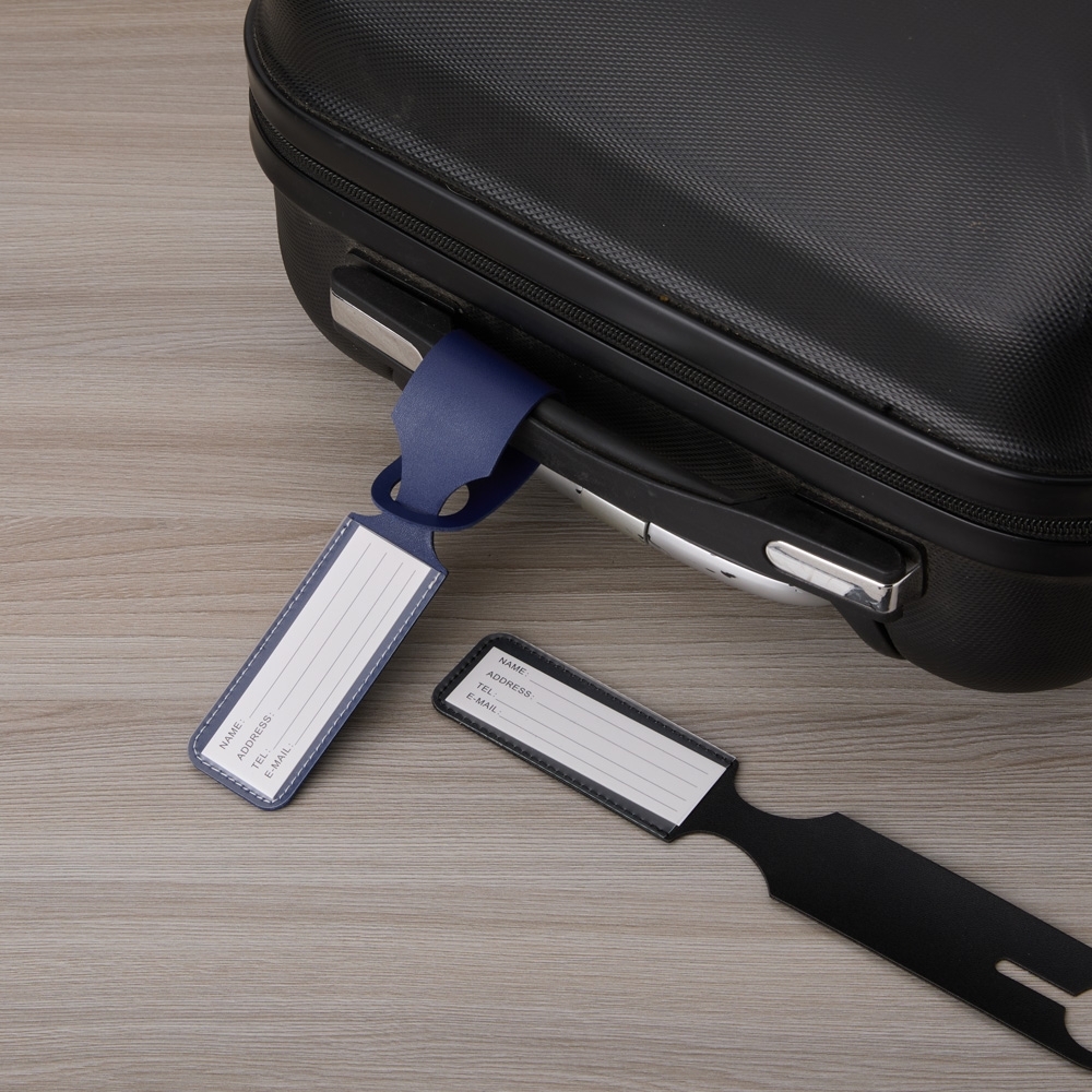 Tag identificador de bagagem em couro sintético. Parte frontal com abertura para visor plástico e verso liso.