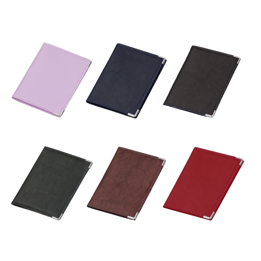 Porta-documento em couro sintético com cantoneira prata, possui 4 divisórias plásticas grande e duas divisórias pequenas.