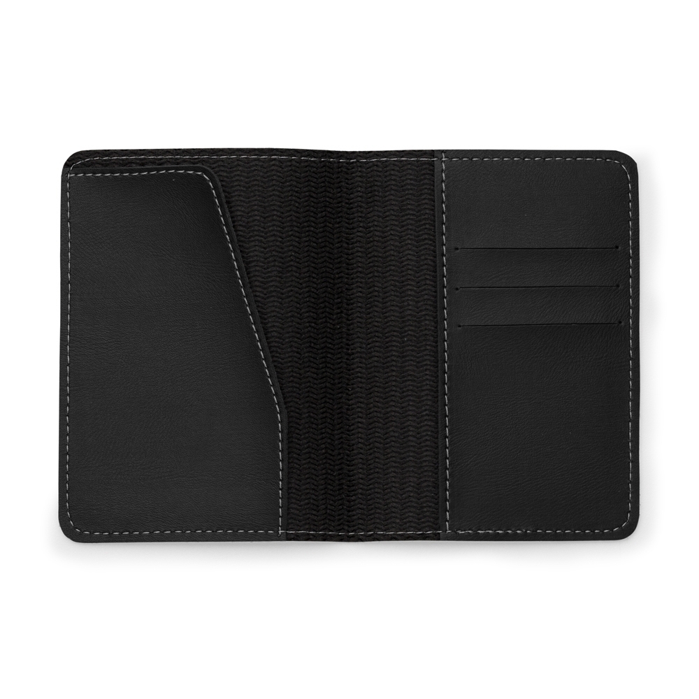 Porta-passaporte Bidins em couro sintético, possui três compartimentos na lateral para cartões.