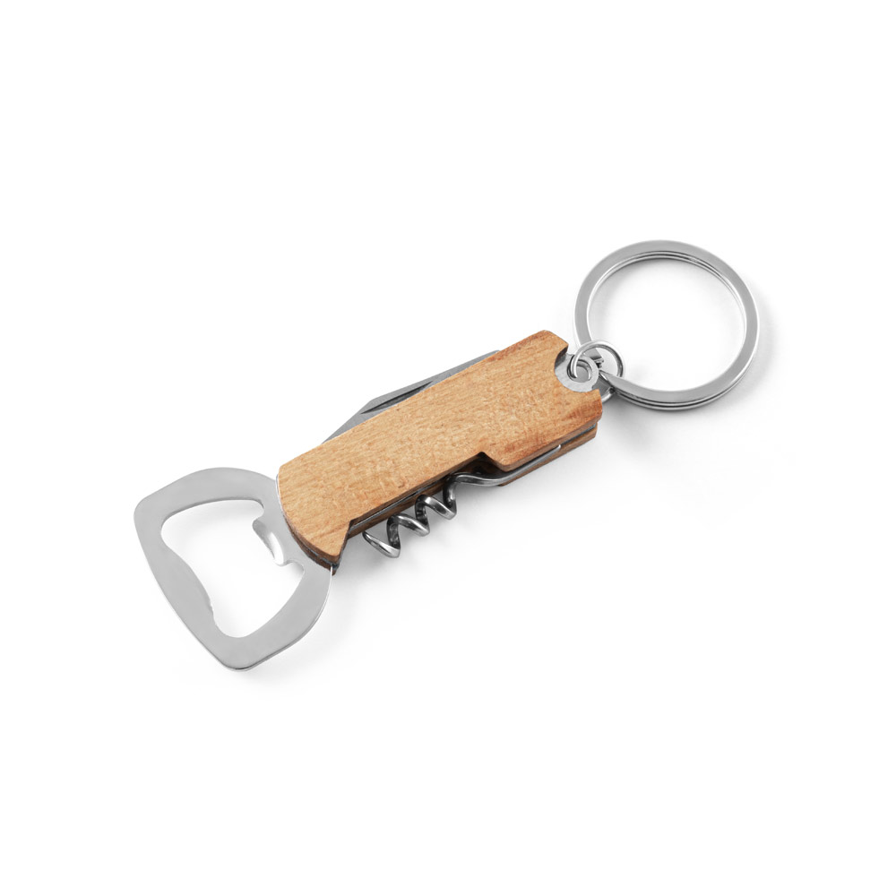 Chaveiro 3 em 1 em bambu com abridor de garrafas, saca-rolhas e canivete. A cor e o resultado da impressão nos materiais naturais pode variar entre produtos. 83 x 35 mm
