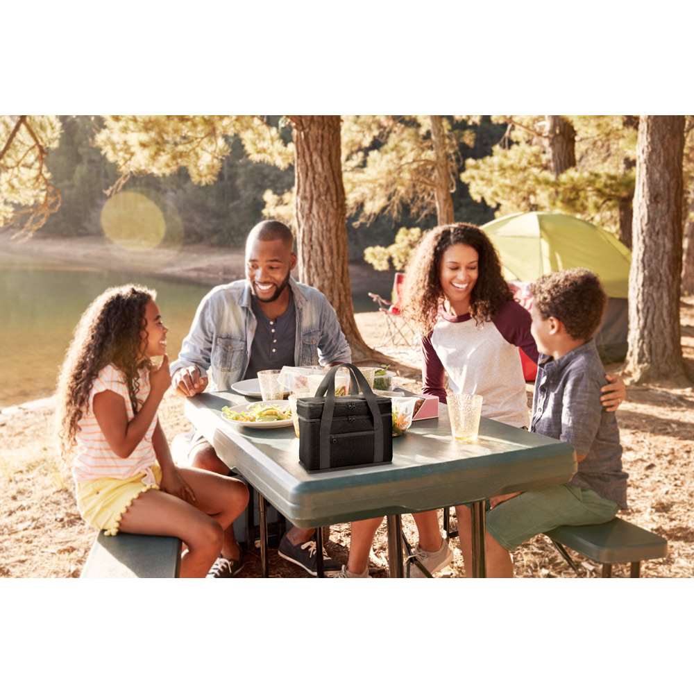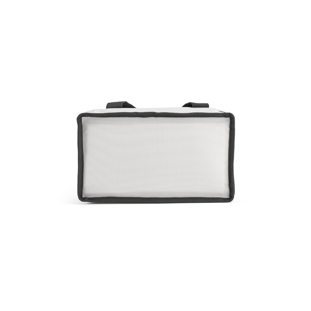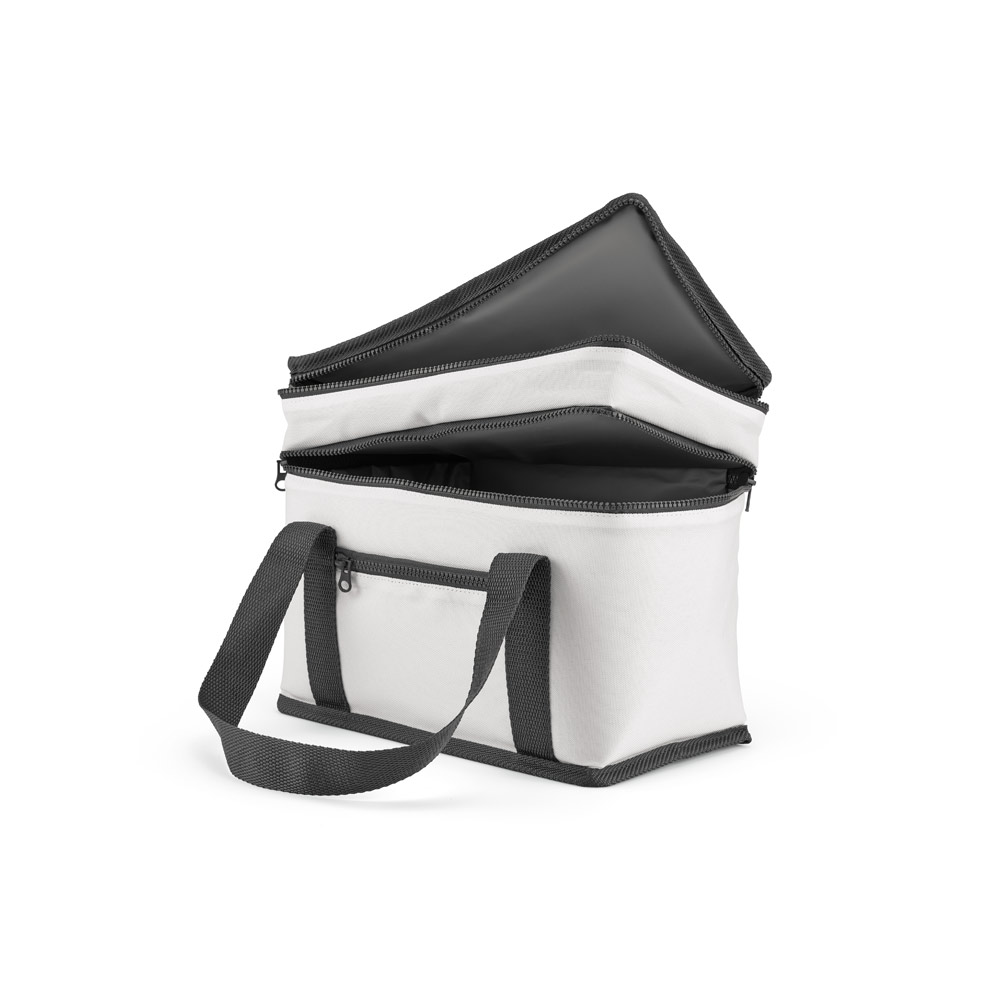 Sacola térmica em poliéster reciclado 600D. Contém 2 compartimentos principais com isolamento em PEVA para facilitar a higienização e um bolso frontal com zíper. Capacidade até 9’5 L. Certificação EU Food Grade. 280 x 230 x 160 mm