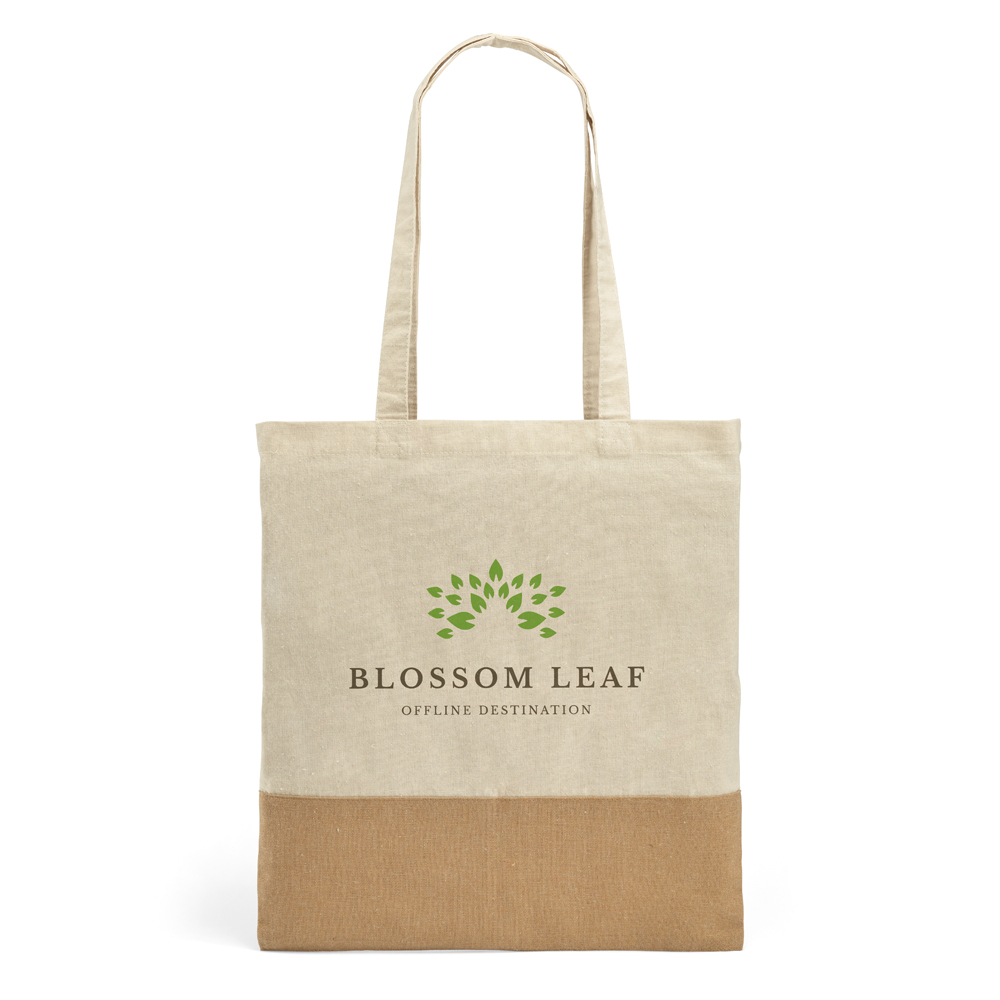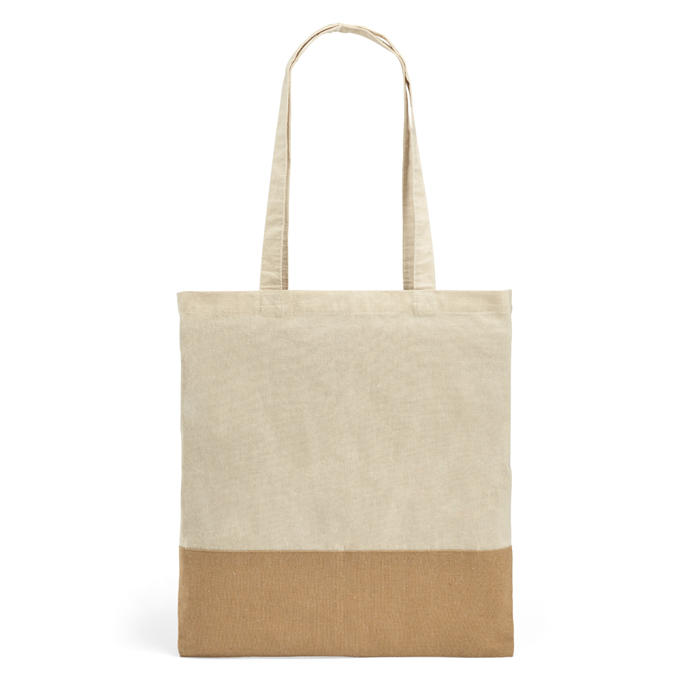 Sacola em 100% algodão (160 g/m²) com detalhe em imitação de juta e alças de 65 cm. 375 x 415 mm