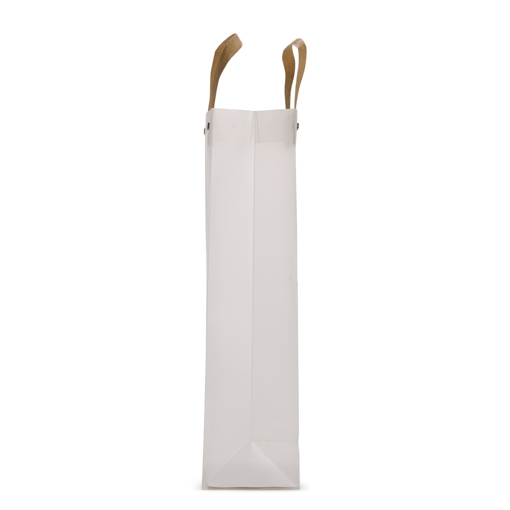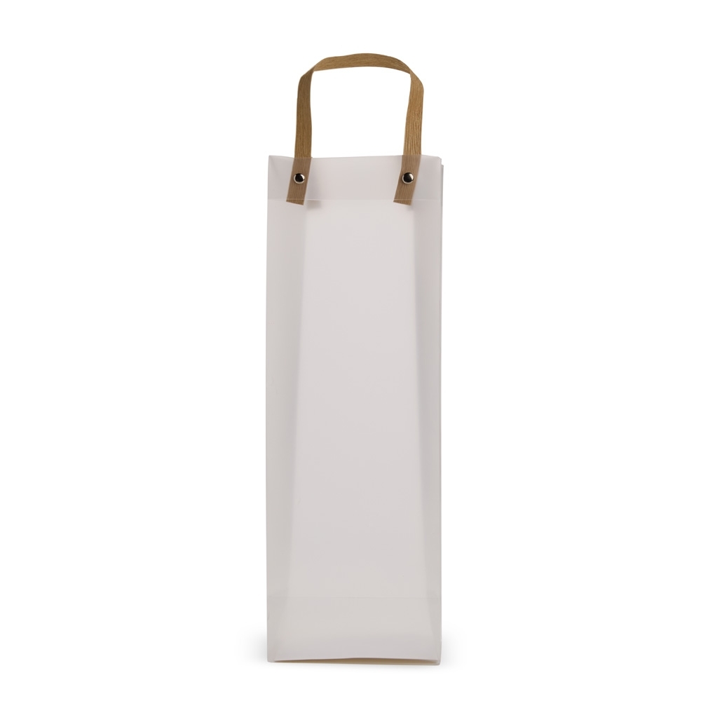 Sacola plástica com formato retangular, acabamento fosco e alças em papelão fixadas por botões metálicos.