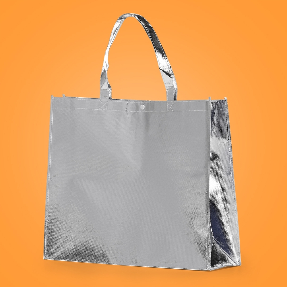 Sacola TNT metalizada 120g/m² com botão. Confeccionado em TNT com revestimento laminado, parte superior possui botão plástico para fecho.