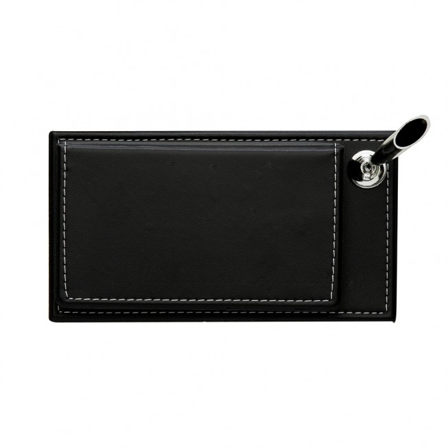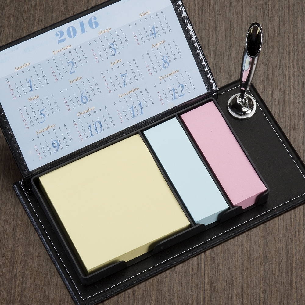 [vc_row][vc_column width=”2/3″]n[vc_column_text]Bloco de anotações com autoadesivos e suporte plástico para caneta (não acompanha. Contém bloco pequeno, conjunto com dois autoadesivos e bolso interno para inserção de folhinha calendário. OBS.: A DISPONIBILIDADE DO CALENDÁRIO VARIA DEVIDO O MODELO SER PRODUZIDO POR DIVERSOS FABRICANTES. Altura : 18,5 cmn Largura : 10,4 cmn n n Espessura : 2 cmn n Medidas aproximadas para gravação (CxL): 8 cm x 14 cmn n Peso aproximado (g): 182n Disponibilidade : Indisponíveln