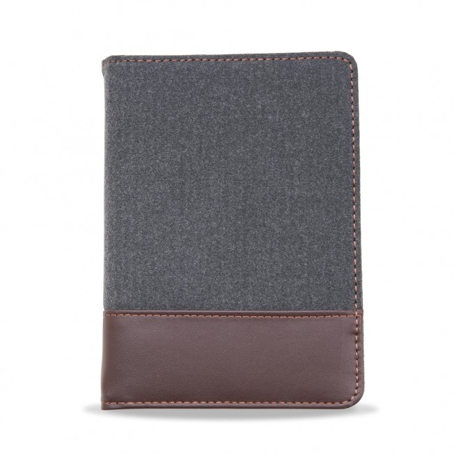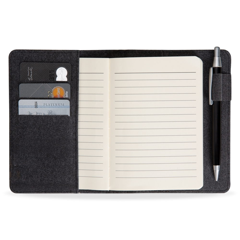 Bloco de anotações com suporte para caneta. Capa de feltro com detalhe inferior em couro sintético, parte interna possui 3 divisões para cartões, aproximadamente 80 folhas amarelas pautadas e contra capa com suporte em feltro para caneta(não acompanha caneta).