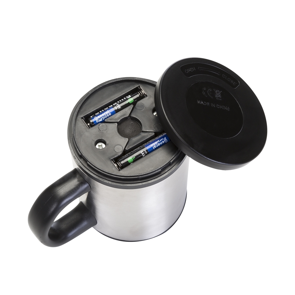[vc_row][vc_column width=”2/3″]n[vc_column_text]Caneca mixer 400ml em inox, possui detalhes preto em plástico resistente (inclusive a parte interna).Tampa rosqueável com uma abertura para poder ingerir o líquido, parte inferior está o compartimento onde é colocado as pilhas 2 AAA (não acompanha), basta rosquear. Para funcionamento basta apertar o botão “STIR” no cabo da caneca e a válvula interna irá começar a girar. Altura : 11,8 cmn Largura : 13,8 cmn n n n n Medidas aproximadas para gravação (CxL): 9,7 cm x 9 cmn n Peso aproximado (g): 231n Disponibilidade : Indisponíveln