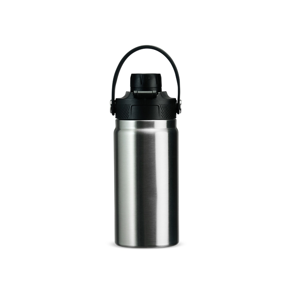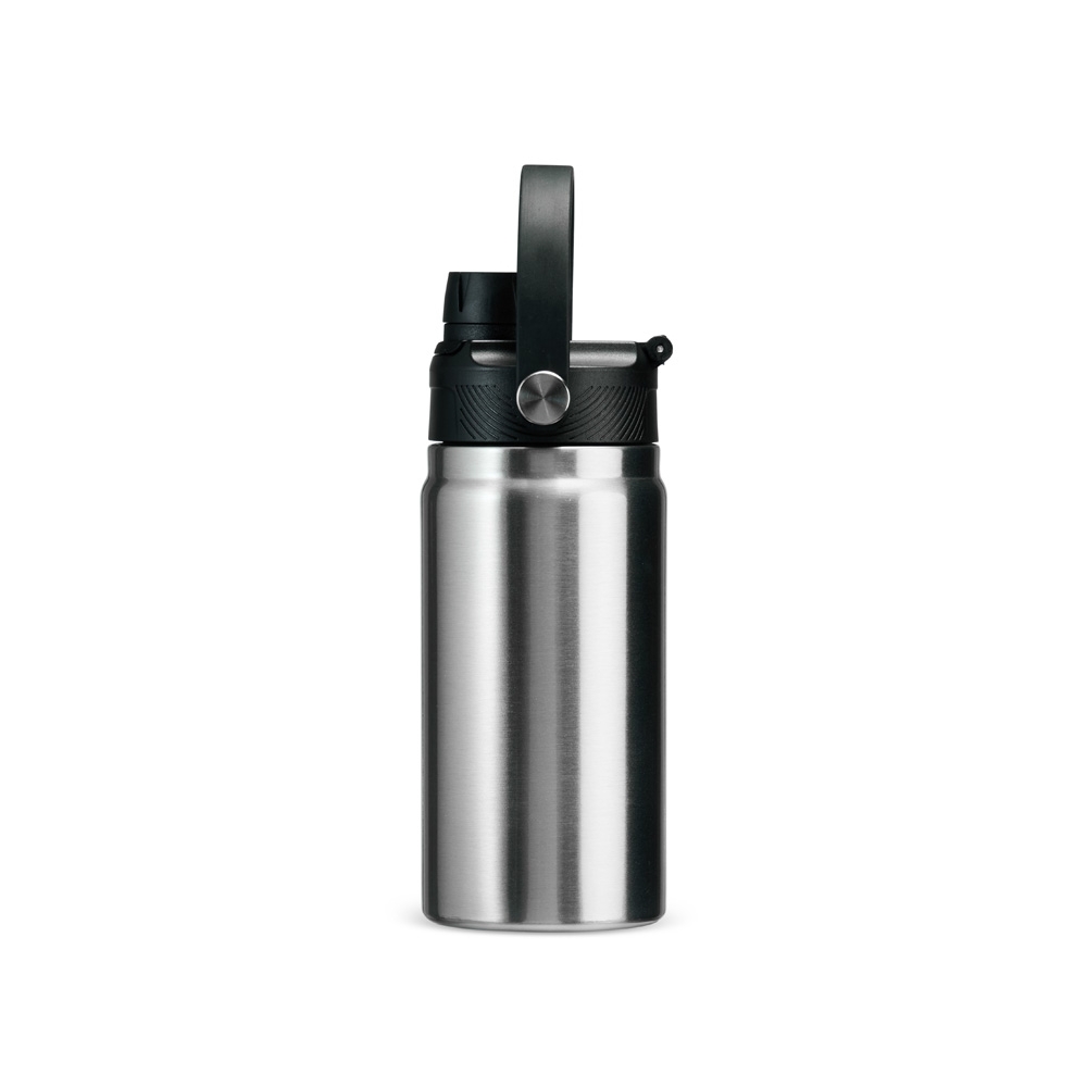 Garrafa térmica em inox com capacidade para até 400ml. Apresenta estrutura de parede dupla e vedação a vácuo, que mantém a temperatura de líquidos por mais tempo sem transferência para o exterior. Possui tampa plástica rosqueável com protetor de o bocal e alça fixa para transporte.