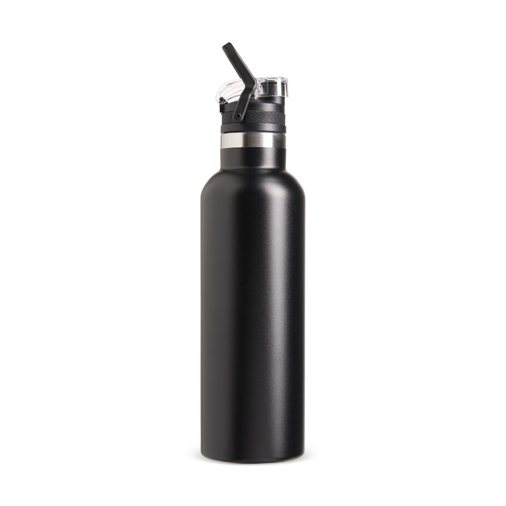 Garrafa térmica em inox 304 com capacidade de até 800ml. Possui estrutura de parede dupla e vedação a vácuo, permitindo conservar a temperatura de bebidas por mais tempo. Apresenta uma tampa rosqueável em plástico com protetor para o bocal e trava de segurança integrada à alça.