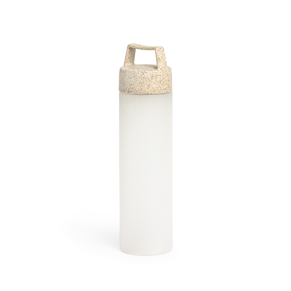 Garrafa plastica com capacidade de 650 ml, com tampa de fibra de arroz rosqueável e alça.