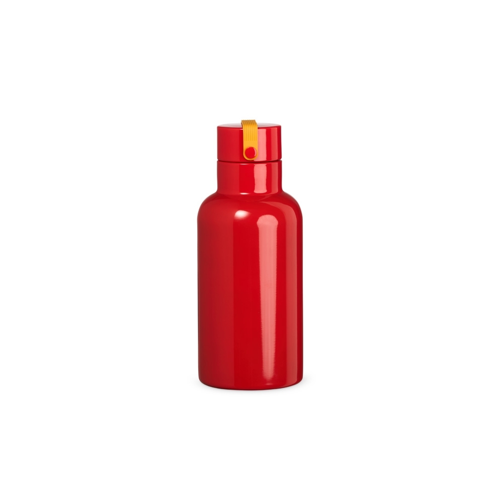 Garrafa térmica de inox 380ml. Contém tampa rosqueável e alça colorida de silicone acoplada na tampa.