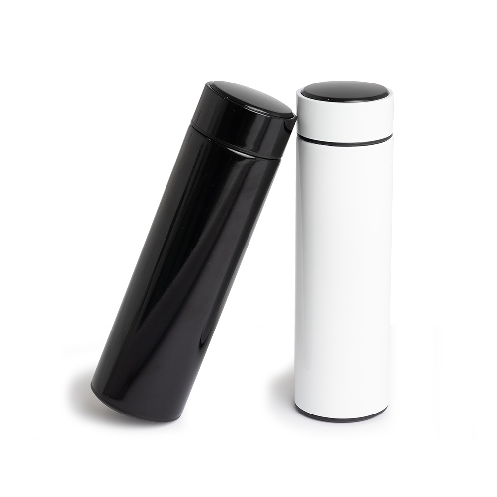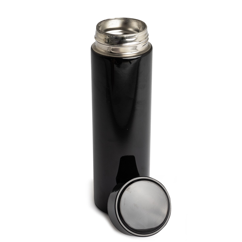 Garrafa térmica de parede dupla em inox, capacidade de 400ml. Tampa com display touch screen de temperatura em led, acompanha infusor de bebidas.
