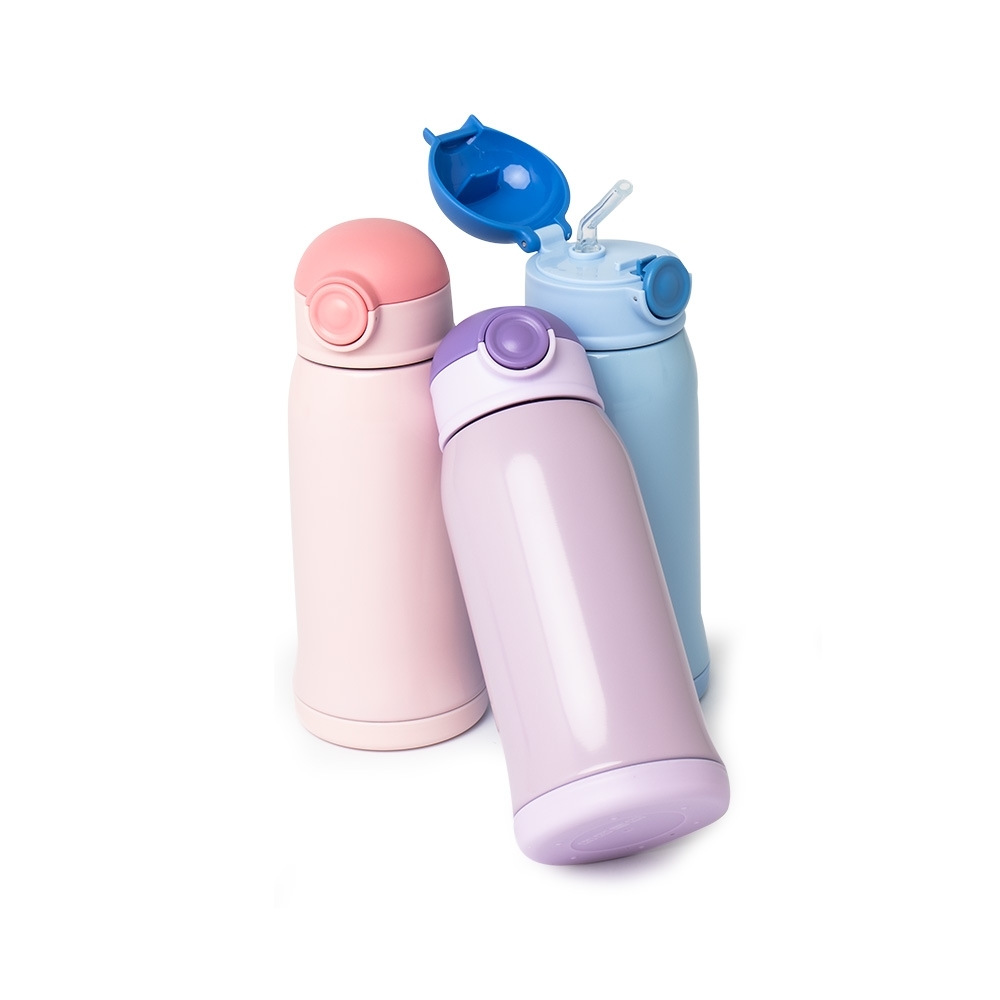 Garrafa Térmica feita em Inox 316, capacidade de 500ml. Tampa rosqueável com botão de acionamento para abrir a tampa protetora do bocal. Acompanha bico de silicone e canudo plástico.