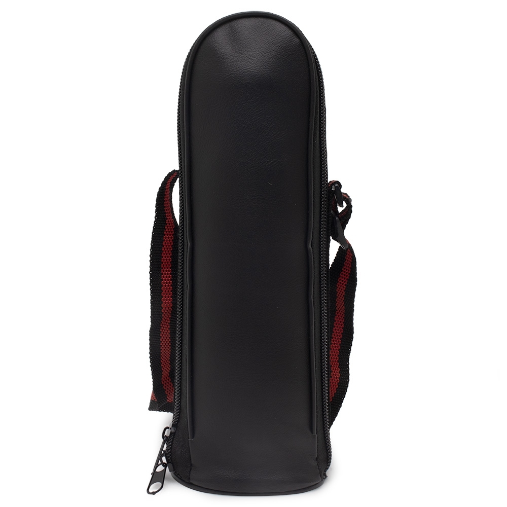 Garrafa térmica 350ml em inox com tampa rosqueável, tampa interna em plástico resistente. Acompanha capa protetora de couro sintético com alça de nylon.