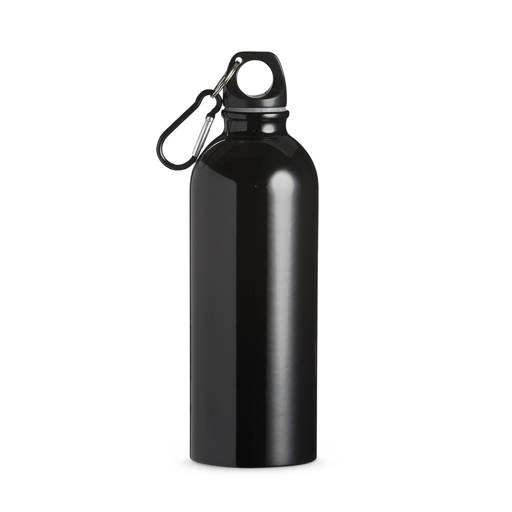 Squeeze 500ml de inox com pintura metalizada, tampa rosqueável e acompanha um segundo bico com mosquetão (não é térmico).