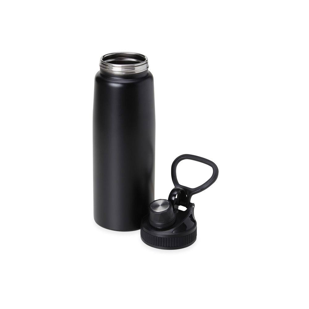 Squeeze inox 900ml com tampa plástica, bocal com tampa protetora e alça para transporte.