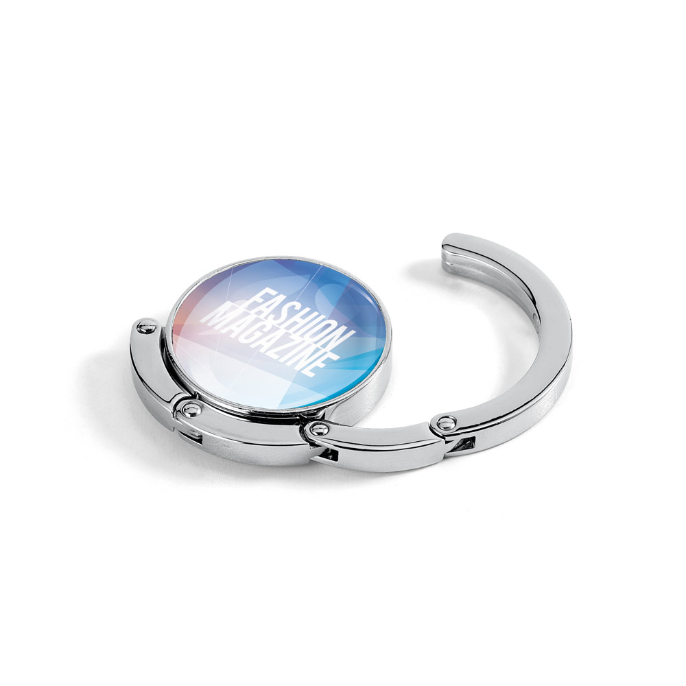 Suporte de bolsa resistente em metal. O suporte pode ser colocado numa superfície para pendurar a sua bolsa. Quando está recolhido permanece junto à base devido ao seu íman. ø45 x 8 mm