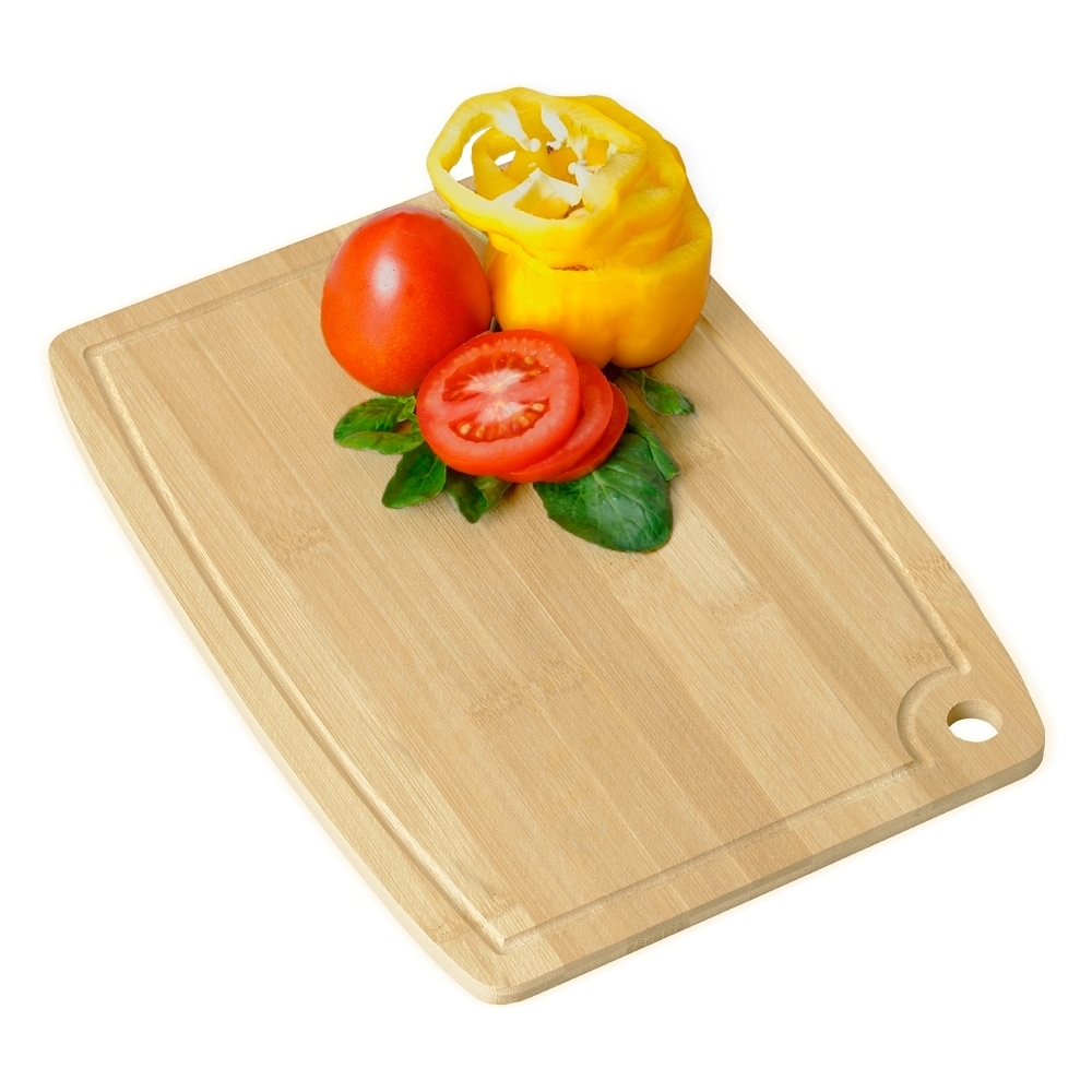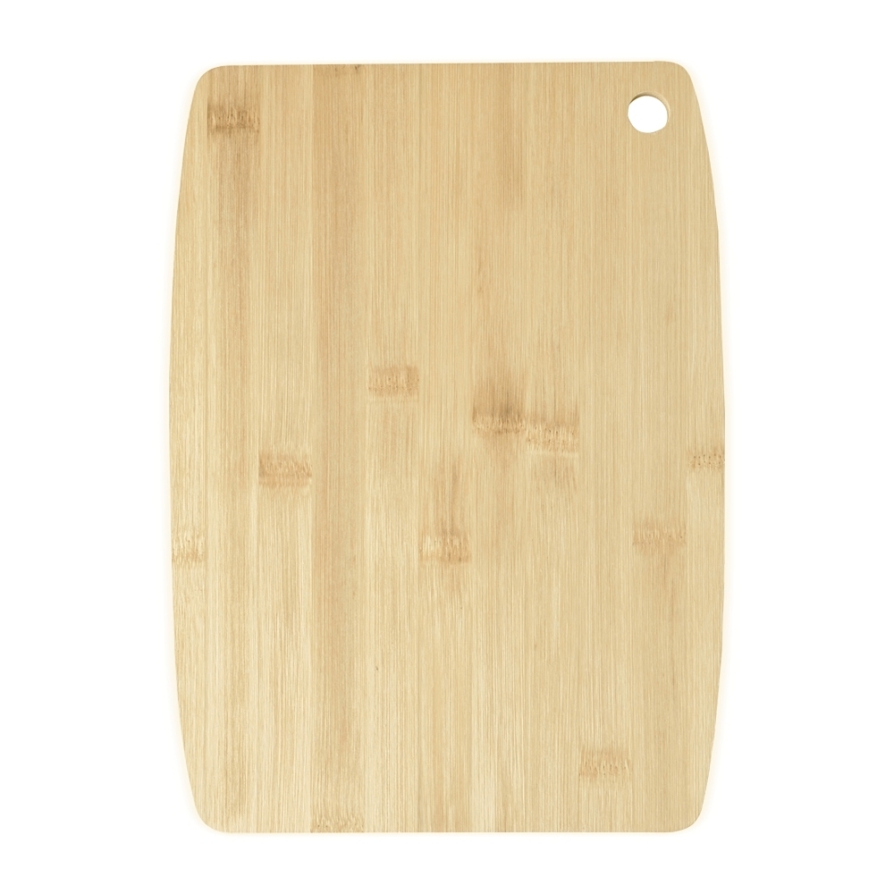Tábua de corte em bambu com canaleta e acesso para gancho.