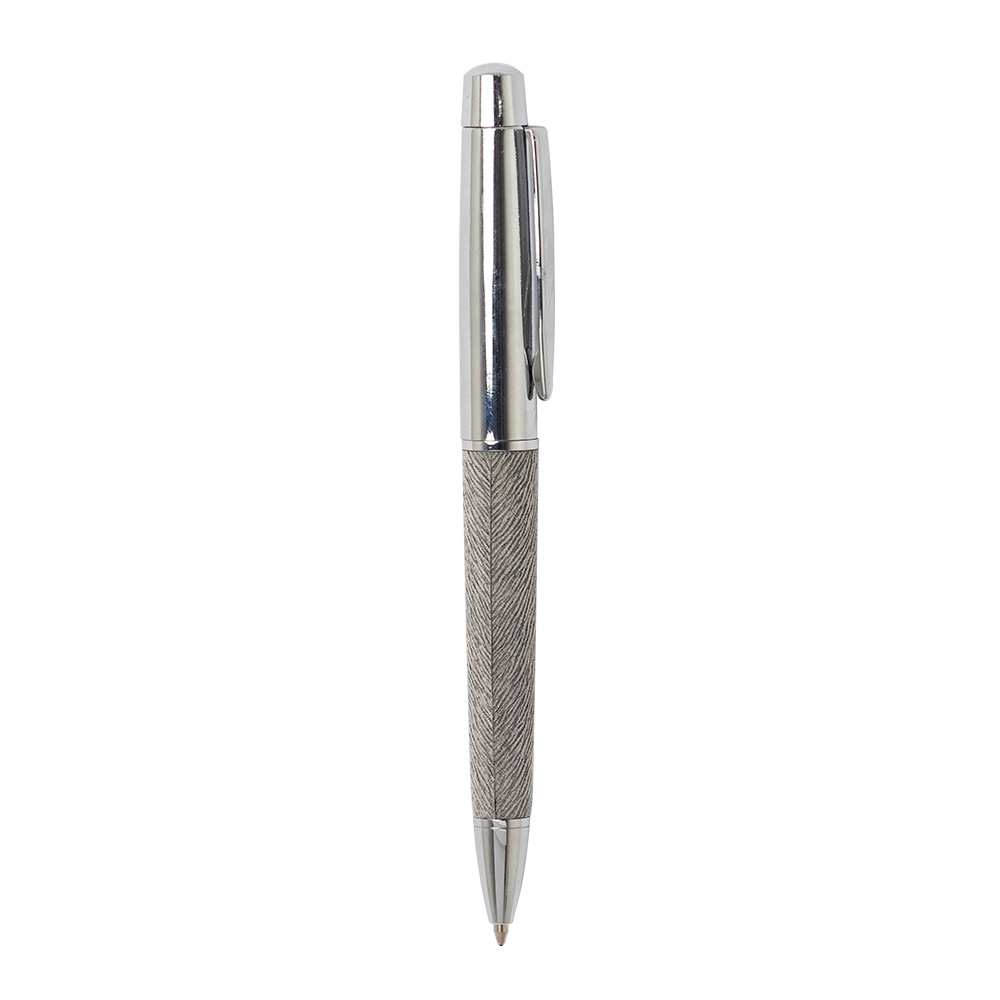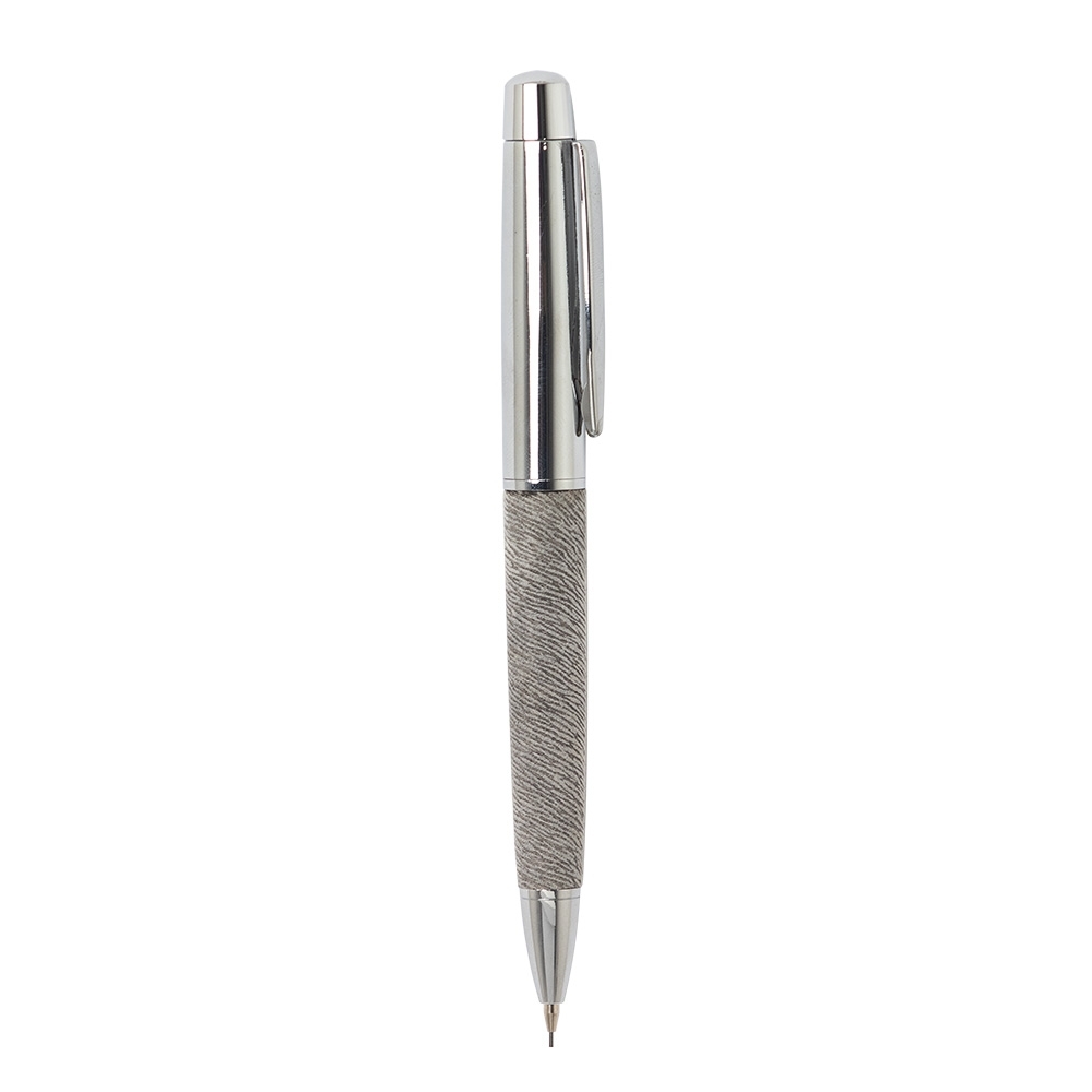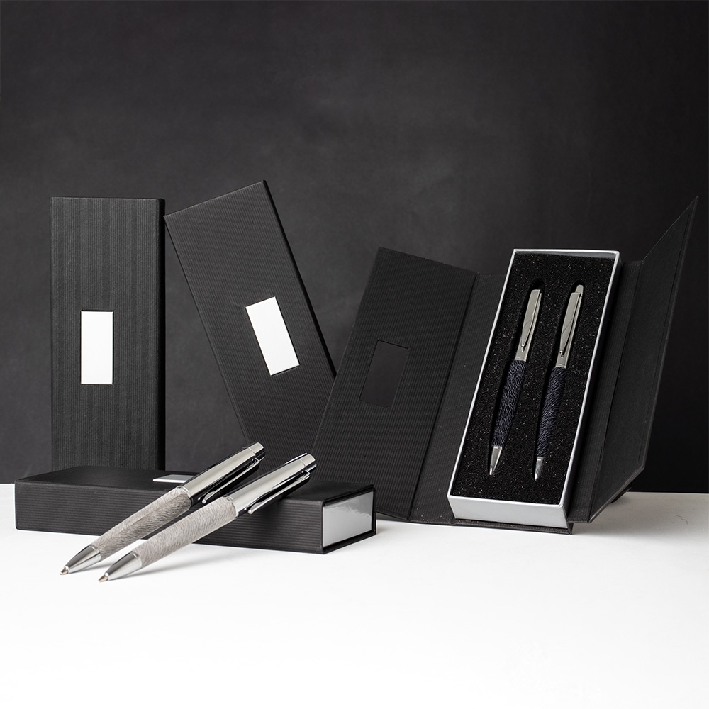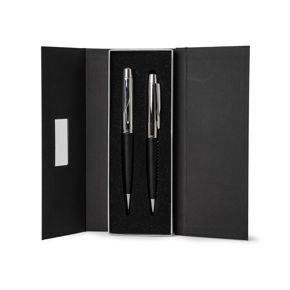 Conjunto caneta e lapiseira em estojo de cartonagem com placa central para personalização. Caneta/Lapiseira metal prata com detalhes diferenciados na parte inferior, clip metal com detalhe de linha no centro. Acionam por giro. Estojo revestido com espuma na parte interna.