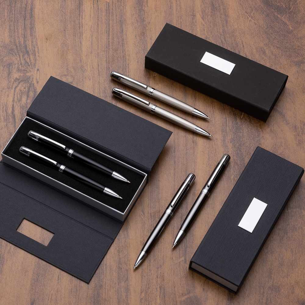 Conjunto caneta e lapiseira em estojo de cartonagem com placa central para personalização. Clip metal com dois anéis em relevo, anel centralizado e dois anéis em relevo na ponteira e acionam por giro. Estojo revestida com espuma na parte interna.