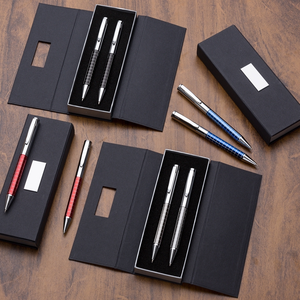 Kit caneta e lapiseira de metal em estojo papelão com placa de metal(parte interna do estojo revestida com espuma). Caneta e lapiseira prata com detalhes coloridos e quadriculados, clip metal com anel superior na ponta e dois anéis centrais e acionam por giro.