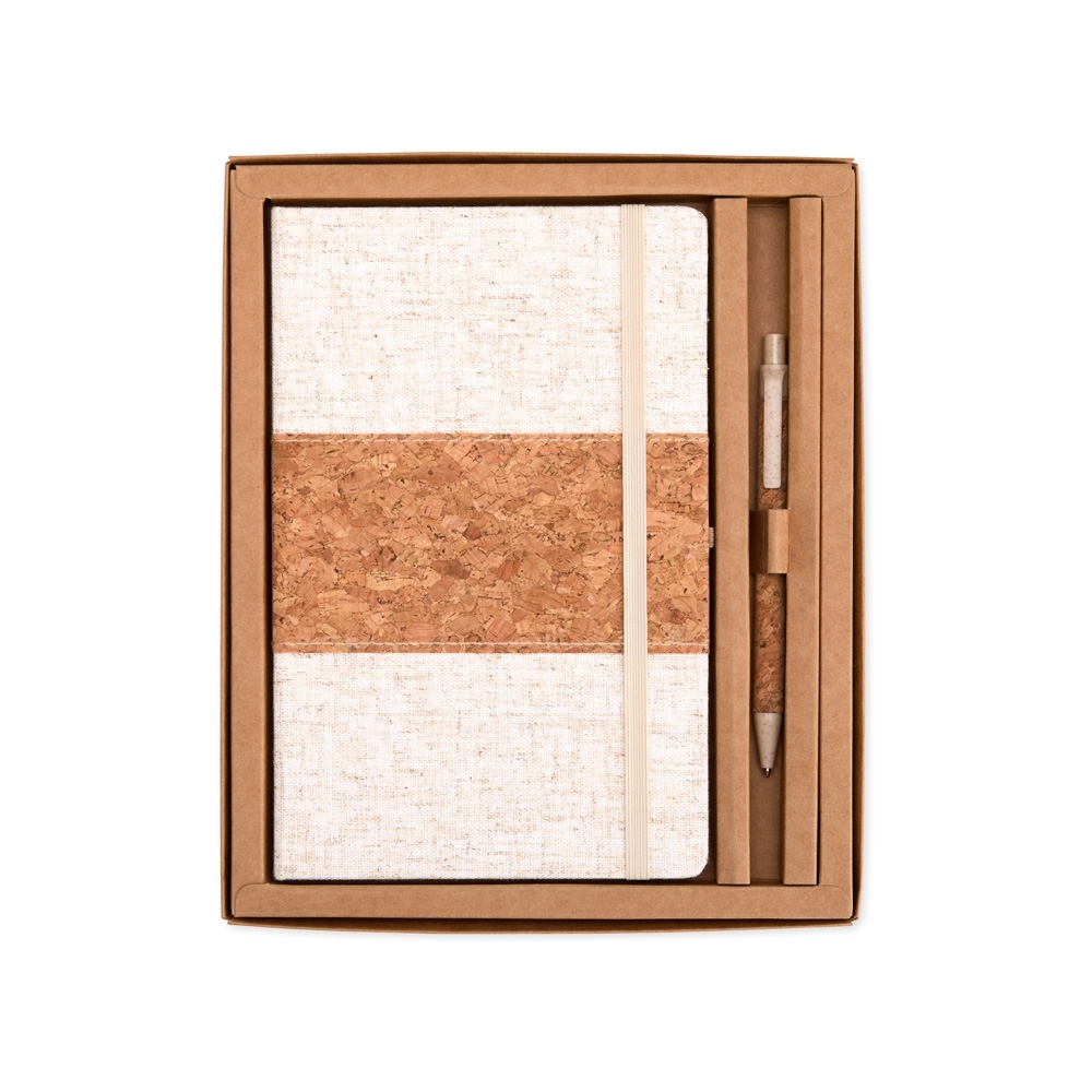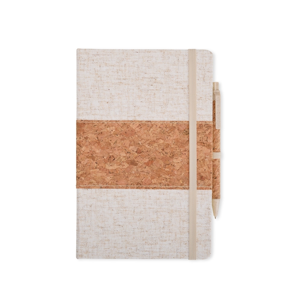 Este kit contém uma Caderneta A5 em linho com detalhe em cortiça e suporte para caneta, marcador de página em cetim, aproximadamente 82 folhas com pauta e caneta de cortiça com detalhes em palha de trigo, carga esferográfica azul 1.0mm e acionamento por clique.